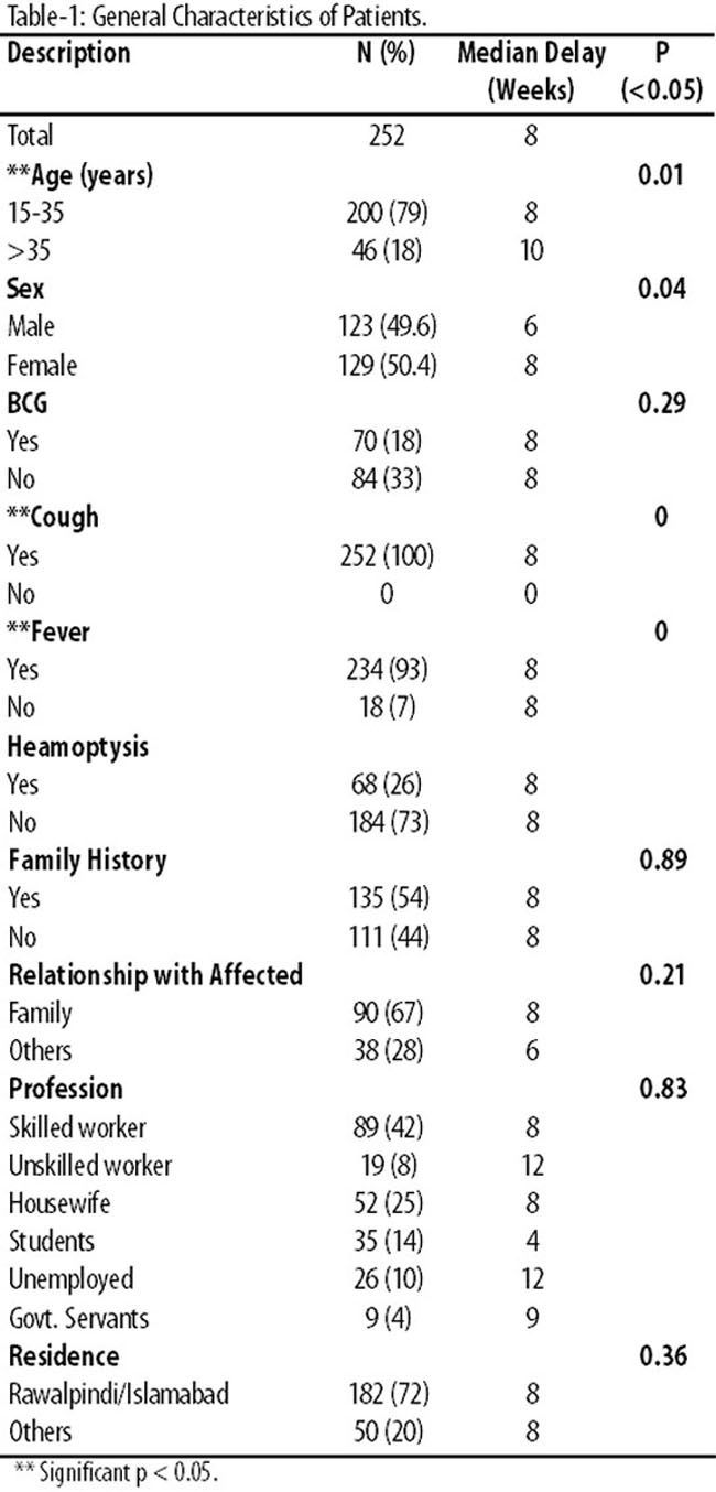 Findings: Interviews of 252 sputum smear positive patients were taken from NTC, Rawalpindi. The duration between on-set of symptoms and start of treatment was considered as the total delay and correlated with general characteristics of TB patients. The proportion of males and females were 49.6% and 50.4% with median age of 25 and 24 years respectively. A median delay of 56 days (8 weeks) was observed which was significantly associated with age, cough and fever. More than 50% of the current patients had a history of contact with previously diagnosed TB patients. The majority of patients (63%) visited health care providers within three weeks of appearance of symptoms but only thirty five percent were investigated for TB diagnosis.