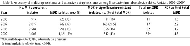 Emergence and spread of multidrug-resistant (MDR) and extensively drug-resistant (XDR) tuberculosis (TB) are facilitated by inadequate detection and treatment.1 TB detection and treatment are more diffi cult in countries, like Pakistan, that are facing complex emergencies, including humanitarian crises and conflicts.2 Published data report an increasing prevalence of MDR TB and emergence of XDR TB strains in Pakistan.3