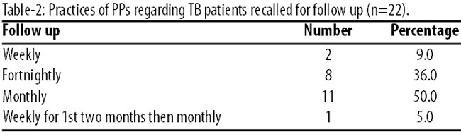 Results: On average, five TB suspects per month were seen by each PP. Only 14% of PPs advised sputum microscopy solely for pulmonary TB diagnosis, while 86% of PPs used different combination of tests (chest x-ray/sputum microscopy/ESR/tuberculin test) for TB diagnosis. Over 40% PPs did not prescribe TB treatment regimen according to TB-DOTS category. Majority PPs (85%) did not follow the treatment through sputum microscopy and instead relied on clinical improvement and x-ray clearance. Nearly 60% of TB patients at PPs clinic did not show compliance to the TB treatment and none of PPs were following the retrieval of default cases.