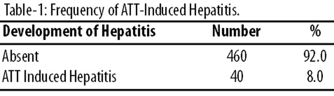 Patients\\\' data was collected and results obtained by analysing the data. The objective of this study was to determine the frequency of ATT-induced hepato-toxicity. This can be a cause of patient morbidity and mortality and lead to non-compliance.