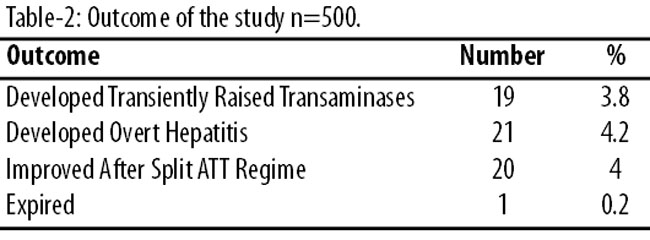 Raised transaminases were noted in 19 (3.8%) patients, and 21 (4.2%) patients developed overt hepatitis (7 males and 14 females), out of whom one (0.2%) male died of Acute Fulminant Hepatitis, while 20 improved after excluding INH and giving split ATT (Table-2).