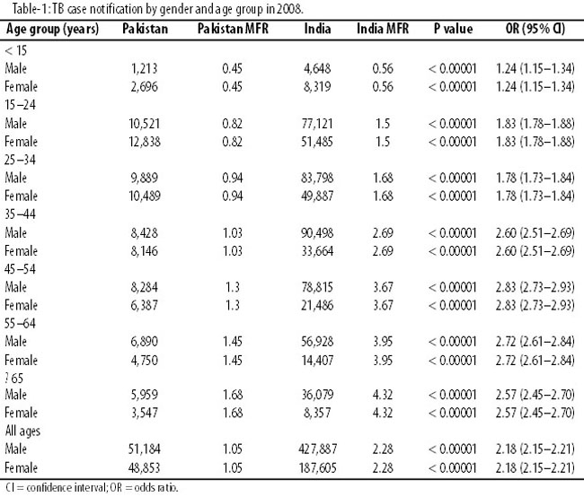 Case notification rates have increased, potentially because of intensified case detection efforts in both Pakistan and India during the 10-year window that was examined; however, the gender patterns in notification rates remained consistent over time. Regardless of the year examined, in Pakistan, the rates of notification are higher in females compared with males in the young age groups (aged 45 years), whereas the rates in those aged ? 45 yeas are higher in males. In India, rates of TB are higher in males in both the young and old age groups.