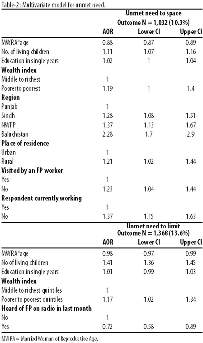 Methods: We conducted secondary data analysis of the Pakistan Demographic Health Survey (PDHS) 2006-7 to understand the context of unmet need in Pakistan. Univariate and multiple regression techniques were used to understand associations. The numbers of women with unmet need were calculated by multiplying PDHS proportions with actual population figures.