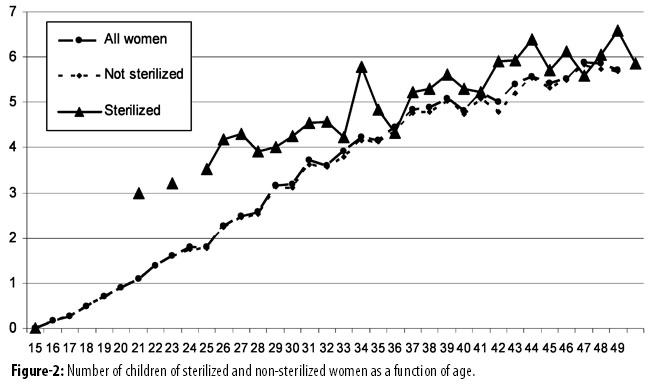 Sterilizations are virtually non-existent among women with one or fewer children and those below the age of 23.The incidence of sterilization increases steadily after age 30 and reaches a plateau around age 40. Sterilized women are considerably older (39 vs. 32 years, p<0.001) than unsterilized women. The educational characteristics of these women and their husbands are similar to those of unsterilized women and their husbands. Although their concept of an ideal family size was similar (4.1 vs. 4.2, p= 0.253), sterilized women have nearly twice as many children than unsterilized women (6 vs. 3.7, p<0.001) (Table-1). Thus, the procedure contributes little to limiting family size. It is noteworthy that women who undergo sterilization have more children at any age than those who are no sterilized (Figure-1).