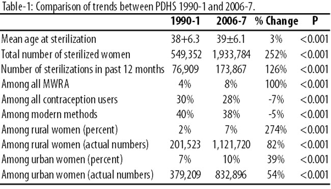 Female sterilization in Pakistan accounts for 38% of all modern methods and approximately eight percent of all MWRA are sterilized. This proportional contribution to all modern methods is consistent with the world average2 and has remained largely unchanged since 1990-1. This proportion of 38% of all FP users — unchanged from 1990-1 — translates into approximately 1.9 million women between the ages of 15 and 49 being sterilized in 2006-7, representing a substantial increase from approximately 550,000 women having sterilization in 1990-1. By 2006-7, approximately 173,000 women were undergoing sterilization annually, which was a considerable increase from 77,000 in 1990-1. The use of sterilization increased far more in rural than in urban locations, which is consistent with the overall FP trend in Pakistan13 (Table-1).