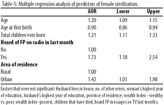had an R2value of 0.227. It showed that the probability of sterilization increased with age and the number of children, and was higher for women who started families early, among urban residents and those who had heard of FP on the radio. There was no correlation with husbands\\\' and wives\\\' wealth or education, or with prior death of children.
