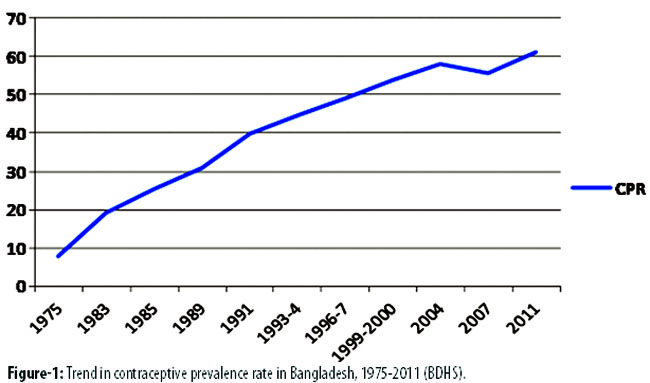 The CPR has increased eightfold over the last four decades to 61.2%, in 2011.5 This is equal to about 25 million of 41 million eligible couples. The trend line for CPR suggests a plateau in 2004 when the level of injectables users fell by three percent in the BDHS 2007 due to a nationwide stock-out. The downturn in CPR recovered in 2007 when supplies became available again in 2008.6
