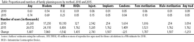 Table shows the method mix — as proportions, not percentages - for modern and any traditional methods, in 2010.8 It also makes a rough projection to 2015 for a more desirable method mix, rather than the current one which is overly dependent on oral pills and under-represents long-acting and permanent methods (LAPM).