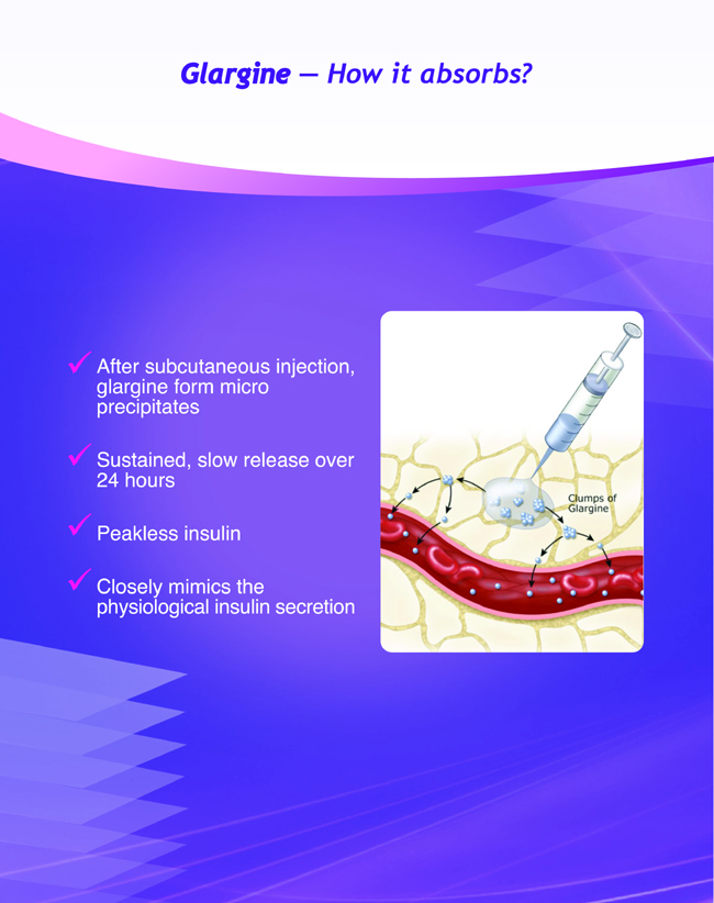The objective of basal insulin replacement was to maintain 24h insulin concentration close to physiological state and could control nocturnal hyperglycemia and morning status without increasing the risk of nocturnal hypoglycemia. Glargine was a long-acting insulin analog synthesized with genetic recombination technology, it could change the molecular structure and physiochemical property of insulin through modifying the types and numbers of amino acid molecule in insulin molecule. After subcutaneous injection, glargine could form micro-sedimentation to delay body absorption and so lengthened acting time and produced stable and longer action, consistent with physiological basal insulin secretion.