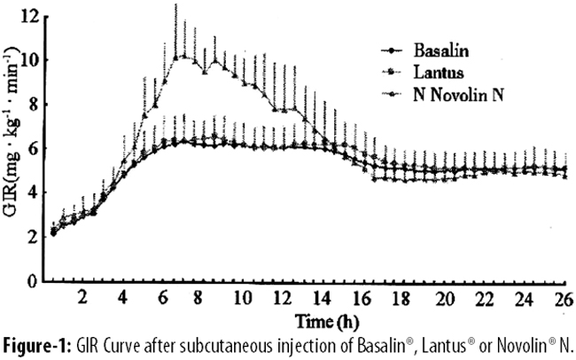It was found in this trial (Fig. 1) that GIR was still higher than baseline 24 hours after subcutaneous injection of Basalin, Lantus and Novolin N. It was reported in foreign literatures that GIR didn\'t decrease to baseline after 30 hours under same trial conditions. Such result was also observed in the similar trial of T1DM patients, meaning more than 24h action of Basalin or Lantus. Clinical practice showed that the metabolism almost disappeared 12~18 hours after subcutaneous injection of Novolin N. In this trial, GIR in Novolin N group was a little lower than that of Basalin or Lantus group over 24 hours, but higher than baseline. Insulin measurement result also showed plasma insulin concentration was a little higher than baseline after 24 hours, similar to foreign reports. This was possibly related to high dosage injection of insulin (0.4U/kg).