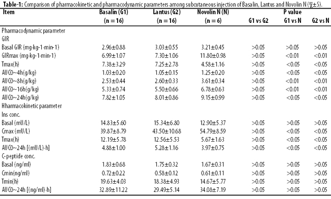 The maximum glucose infusion rate (GIRmax) of Basalin or Lantus group was significantly lower than that of Novolin N group (P < 0.05), the time to reach GIRmax (Tmax) was also significantly behind Novolin N group (P < 0.05) (Table 1).