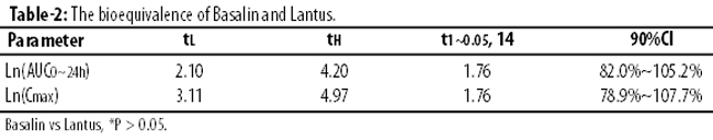 Main pharmacokinetic parameters Cmax and Tmax were taken as the measured value, and significance of Ln(Cmax) and (AUC0gt) was measured with ANOVA. The inter-drug bioequivalence was evaluated with the statistic analysis two one-sided tests and 90% CI calculation. If the candidate preparation- Ln (AUC0gt) was in the range of 80% to 125% of the reference preparation and candidate preparation -Ln(Cmax) was in the range of 70% to 143% of reference preparation, it could be determined the candidate drug was bioequivalent to the reference preparation. If there were no significant differences upon the rank test of Tmax, it could be determined the candidate preparation was bioequivalent to the reference preparation.