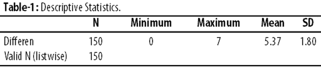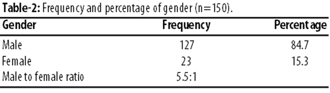 Of the 150 patients in the study, there were 127(84.7%) males and 23(15.3%) females. Male-to-female ratio was 5.5:1 (Table-1).