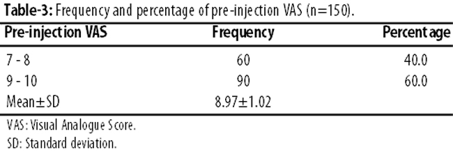 The pre-injection VAS reading was 7-8 in 60(40%) patients and 90 (60%) had 9-10. Mean VAS was 8.97±1.02 (Table-3).