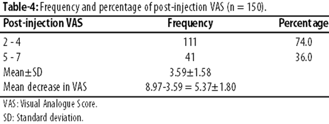 Post-injection VAS was 2-4 in 111(74%) patients, and 41(36%) had VAS 5-7. Mean post-injection VAS was 3.59±1.58. Mean decrease in VAS was 5.37±1.80. (Table-4).