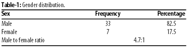 Of the 40 patients in the study, 33(82.5%) were males and 7(17.5%) were females. The male-to-female ratio was 4.7:1 (Table-1).