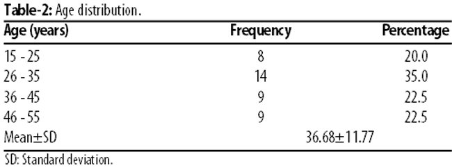 There were 8(20%) patients in age group 15-25 years, 14(35%) in 26-35 years, 9(22.5%) in age group 36-45 years, and 9(22.5%) in age group 46-55 years. The overall mean age was 36.68±11.77 years (Table-2).