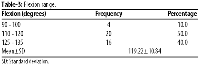 In terms of flexion, 4(10%) patients had between 90-100 degrees, 20(50%) between 110-120 degrees and 16(40%) between 125-135 degrees. The mean flexion was 119.22±10.84 degrees (Table-3).