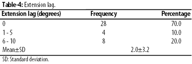 Besides, 28(70%) patients had 0 degree of extension lag, 4(10%) between 1-5 degrees and 8(20%) between 6-10 degrees. The mean of extension lag was 2.0±3.2 degrees (Table-4).