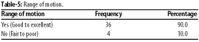 Overall, 36(90%) patients had good to excellent ROM, while 4(10%) had poor ROM (Table-5).