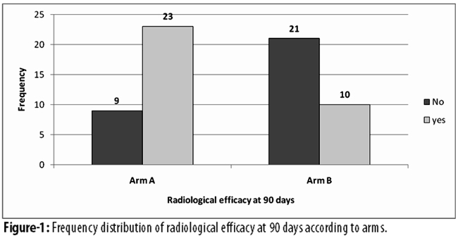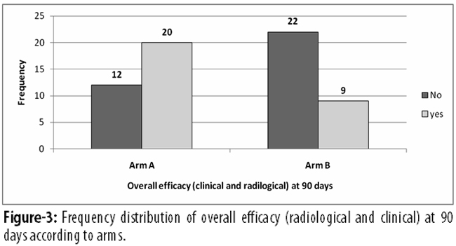 Radiologically at 90 days, there was highly significant difference between SrR group (n=23; 71.9%)and placebo group (n=10; 32.3%) (p=0.002) (Figure-1).
