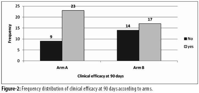 Clinically at 90 days, 23(71.9%) in Sr R group and 17(54.8%) in the placebo group attained clinical efficacy. However, it was not statistically significant (p=0.196) (Figure-2).