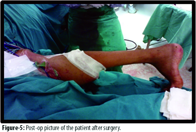 Patients were kept in house for 5 to 6 days postoperatively. Drains were not used. On day 12 stitches were removed. When the wound got healed and bone ends were progressing well, the patients were fitted with external prosthesis and encouraged to walk usually at 6 weeks. The patients were followed up regularly in the outpatient department (OPD) for a period ranging from 6 months to 34 months (Figures 1-5).