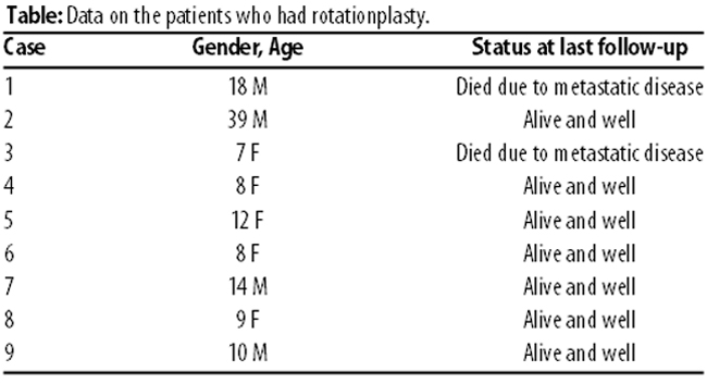 Conclusions: Van Nes Rotationplasty was found to be a successful alternative to amputation in cases of locally advanced tumours of distal femur or proximal tibia.