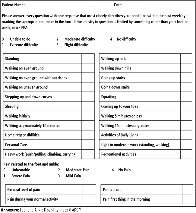 9. Martin RL, Burdett RG, Irrgang JJ. Development of the Foot and Ankle Disability Index (FADI) J Orthop Sports Phys Ther 1999; 29: A32-3.