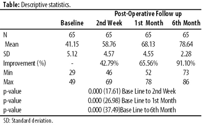 Data entry and analysis was done using SPSS 11.5. Qualitative variables like gender were presented by frequency and percentage. Quantitative variables like age, pre-operative and post-operative HHS were presented as mean and standard deviation (SD). The pre- and post-operative mean HHS were compared and percentage improvement was measured. Improvement in baseline HHS was calculated using paired t-test.