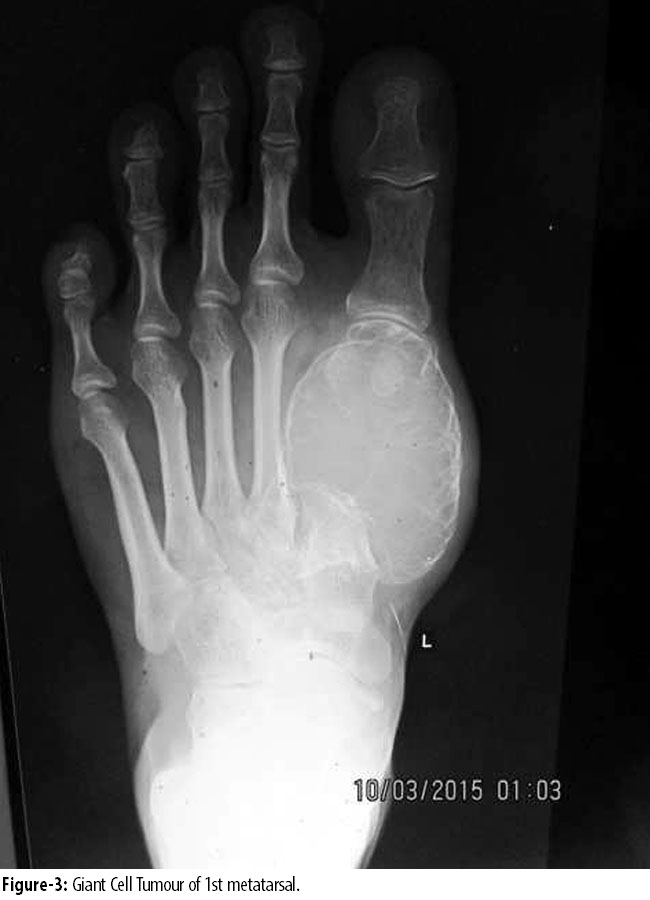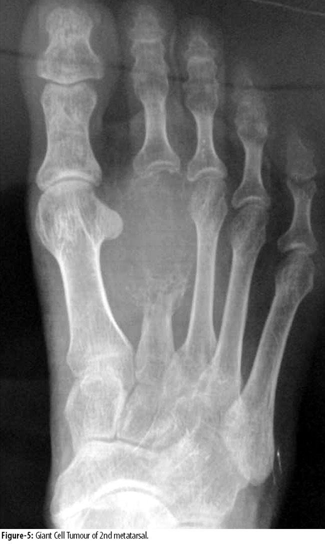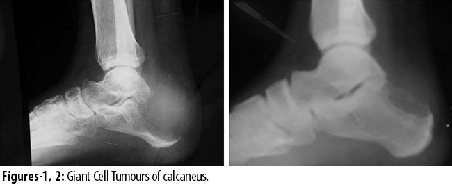 Giant cell tumours (GCTs) represent 5% of bone neoplasms1 and only fraction of it occurs in foot. They occur in patients 20 to 40 years old, and there is a slight female predominance. These tumours frequently are more aggressive. Common sites are femur, tibia and distal radius. GCT of foot bones,2 hand and spinal involvement is rare.3 Any foot bone may be involved. Giant cell tumours of foot usually are solitary lesions, but 1% to 2% may be synchronously or metachronously multicentric. These tumours typically are benign. Foot GCTs are eccentrically located in the foot bones and usually about the subchondral bone of epiphysis, compressing cortex to a thin rim. Radiographically, the lesions are purely lytic. Foot lesions frequently expand and occupy mostly half of the bone or break through the cortex, but intra articular extension is rare.4 Treatment options of foot lesions depend on the stage of the disease and include curettage/extended curettage with adjuvants and filling the defect with bone cement or bone graft,5,6 resection arthrodesis, resection reconstruction and resection arthroplasty. In metastatic lesions, radiation7 or embolization and chemotherapy options are used.