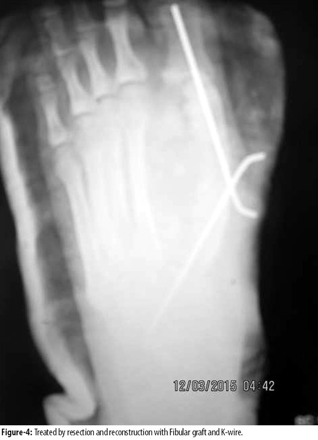 Different authors have recommended different treatment options for individual foot bones GCTs with different results like resection, excision intralesional or wide margin, curettage and amputation. Some procedures were supplemented by fibular or iliac crest bone grafts. Oliveira VC et al16 and Xing R et al17 recommended intralesional curettage with adjuvants for treatment of foot bone for stage 2 GCT. We did resection and curettage with fibular and cancellous bone graft for calcaneus stage 2 GCT. Khatoon Z et al18 showed resection of calcaneus in stage 2 GCT. We did curettage and bone graft of stage 2 talus GCT. Song KS19 did intralesional curettage and bone grafting of stage 2 GCT, while Ramdas A et al20 did curettage of stage 2 talus GCT and Michael B et al21 did excision of talus for stage 3 GCT. We did en bloc resection and curettage with fibular and cancellous bone grafting in metatarsal GCT. Siddiqui YS et al,22 Mahajan S et al23 and Yurdoglu C et al24 did resection of stage 3 tumour of 1st and 2nd metatarsals respectively and did reconstruction of defect with fibular strut and iliac crest cancellous bone graft and K-wire fixation. Wang EH25 did allograft reconstruction of first metatarsal stage 3 lesion. Yokouchi M et al26 did amputation of toe for stage 3 GCT distal phalanx 4th toe. Bacchal V et al27 and Dridi M et al28 did en bloc resection of stage 3 GCT distal phalanx of big toe and proximal phalanx 3rd toe respectively. We did fibular bone graft of stage 3 GCT big toe proximal phalanx and amputation of 3rd toe.