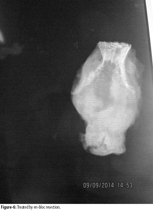Duration of symptoms ranged from 4 to 12 months with a mean of 6.54 months (SD 4.08). All the tumours presented as expansile lesion, destroying cortex in 8(3.3%) cases. In all cases, lesion was more than half the diameter of the bone and thickness of sub-chondral bone in adjacent articular surface was less than 5mm to 0mm. All of them had extension into the soft tissue. Open biopsy was performed in 7(2.9%) cases. In 6(2.5%) cases, fine needle aspiration cytology (FNAC) was diagnostic, showing giant cell lesion. 1(0.4) calcaneal giant cell tumour was treated by extended curettage and filling the cavity with fibular head compact bone graft. Other 2(0.8%) cases of calcaneal giant cell tumour were treated by complete resection of calcaneus. 1(0.4%) case of talus GCT was treated by curettage and bone grafting. Out of 7(2.9%) cases of metatarsals, 4(1.6%) were in 1st metatarsals, 2(0.8%) in 2nd metatarsal and 1(0.4%) in 3rd metatarsal. 2(0.8%) GCTs in 1st metatarsal (Figure-3 and 4)