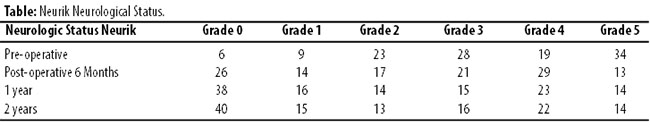 Methods: The quasi-experimental study was conducted at the Department of Spine Surgery at Combined Military in a tertiary care hospital in Rawalpindi from 2006 to 2013. A pre-designed proforma was used for each patient and records were kept a custom-built computer database. Neurik grading was used to assess neurological status preoperatively, at 6 months, 1 year and 2 years.