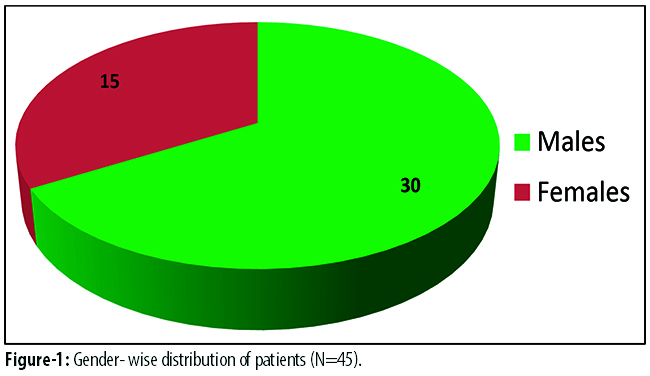 Methods: The case series was conducted at Hayatabad Medical Complex, Peshawar, from January 2012 to April 2015, and comprised consecutive patients with non-union of the tibia. Patients of either gender, with complex non-union of the tibia from the age of 18 to 65 years were included, while patients with intra-articular fractures, vascular injury, smokers and steroid users were excluded. Outcome of the treatment was graded by using the scoring system of Association for the Study and Application of Methods of Ilizarov.