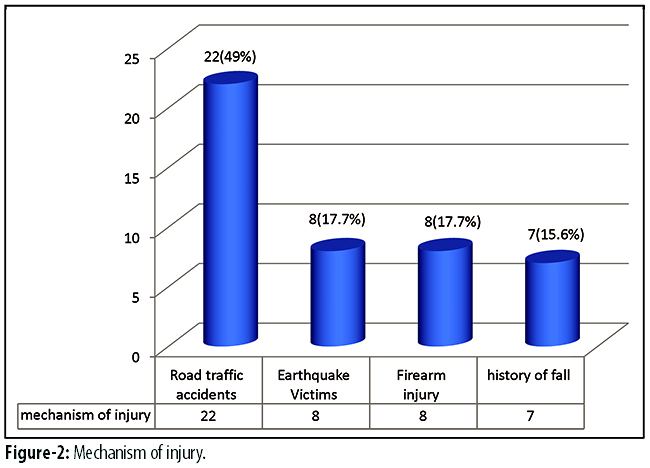 Twenty (95.2%) patients healed successfully without any complication, while 1(4.8%) patient had shortening of 3 centimetres, deformity and infection, and the mean time to union was 8 months (range:4 to 12).