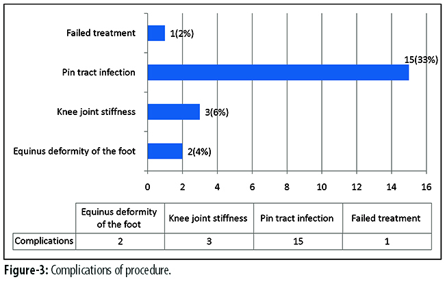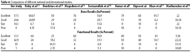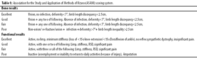 A study13 on tibial non-union treated with Ilizarov fixators showed excellent bone results in 60.87% cases, good in 26.09%, fair in 8.7%and poor in 4.35% cases. Functional results were excellent in 64% cases, good in 28%, fair in 4% and poor in 4%cases.
