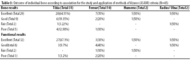 In almost all our patients at the time of frame removal and subsequent follow-up, infection had been eliminated. As we followed up our patients for 9 months, only one patient had chronic osteomylitis that was treated with no discharge, but there is possibility of a flare up which cannot exclude the absence of recurrence of infection. It is a good result in ASAMI criterion. In this study, bone results were better than the functional results. One thing is very clear that excellent bone results do not necessarily guarantee good functional results. The functional result is affected by many other factors like conditions of the muscles, vessels and the joints.