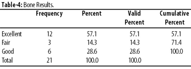 At final follow-up, the bone results were excellent in 12(57.1%) patients, good in 6(28.6%) and fair in 3(14.3%) (Table-4).