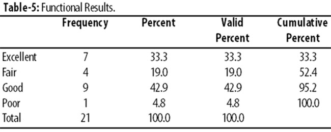 Functional results were excellent in 7(33.3%) patients, good in 9(42.9%), fair in 4(19%)and poor in 1(4.8%) (Table 5) (Figure-1-4).