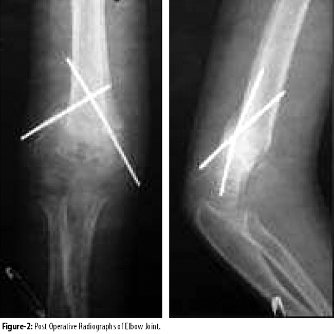 In our study after osteotomy and desired correction, osteotomy was fixed with cross K-wires. We found that it was more stable and safe as compared to Kim et al who did step cut osteotomy in 19 patients to reduce residual protrusion of the lateral or medial condyle.10 He did rigid fixation with Y-shape plate by using, posterior approach and found that it provides firm fixation that allows early movement of the joint. We used anterolateral approach to avoid triceps tongue or splitting to avoid fibrosis and limitation of joint movements. Decreased movements were noted in only three patients which were improved after physiotherapy.