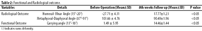 In our study the carrying angle was improved from varus to valgus clinically and radiologically both HUA and MDA were corrected and they were within normal range and p value <0.05 which was significant (Table-1 & 2).