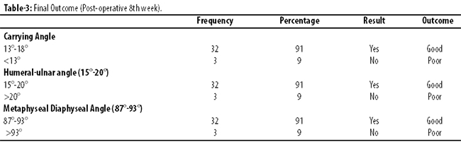 Out of 35 patients in 33 patients, the functional and radiological outcome for carrying angle, HAU and MDA improved within normal ranges showing good results (Table-3). Five patients had superficial pin track infection which was treated with first generation cephalosporin and sterile dressings with pyodine solution. Two patients had loss of fixation and correction which improved after revision surgery and result was satisfactory. There was no lateral prominence. The range of elbow joint movement in three patients was restricted which required physiotherapy. Cosmetically all patients were satisfied with the outcome. Ulnar nerve palsy was noted in three patients which improved after three weeks.