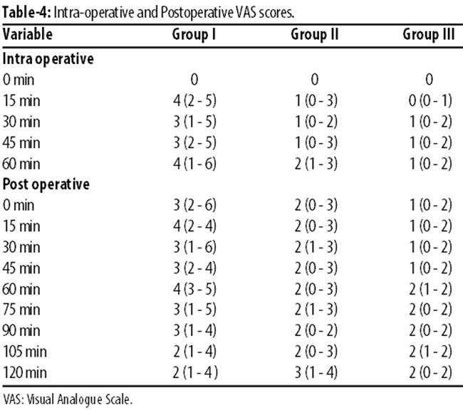 Groups II and III had significantly less VAS scores compared to group I (p<0.001), whereas patients in group II reported higher VAS scores compared to group III (Table-4).