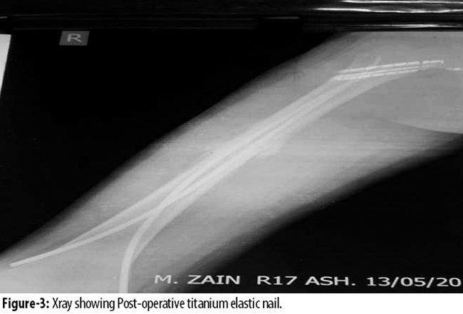 Majority of the patients underwent surgery within two days of their injury. Two titanium elastic nails of identical diameter were used (Figure-2).
