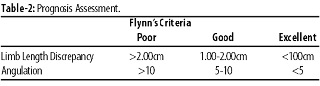 Fracture union time was 4-6 weeks in group A and 9-12 week in group B. Radiological evidence of union was achieved in all cases. Flynn\\\'s criteria was used to assess prognosis (Table2).