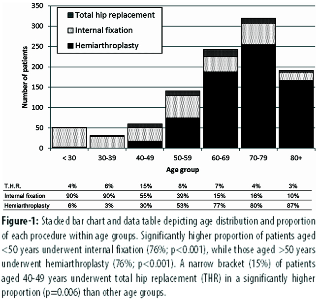 Records of 1039 patients were reviewed. Hemiarthroplasty was the most common procedure in 68% patients (Table-1). Internal fixation was the most common procedure in patients aged <50 (p<0.001), and hemiarthroplasty for those aged >50 years (p<0.001). THR was seen in its highest proportion (15%) in patients aged 40-49 years (p=0.006) (Figure-1).