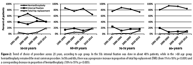 Results: Records of 1039 patients were reviewed. The proportion of patients in the 70+ years age group significantly increased from 45% to 52% over the two decades (p=0.033). Proportion of patients undergoing total hip replacement increased by more than 3 times from 2.6% to 8% (p<0.001).Internal fixation was the most common procedure in patients aged <50 (p<0.001), and hemiarthroplasty for those aged >50 years (p<0.001). Total hip replacement was seen in its highest proportion (15%) in patients aged 40-49 years (p=0.006). Hemiarthroplasty showed a dramatic decrease in the age group 50-59 years (from 57% to 40%). Total hip replacement showed a steady increasing trend over the last 20 years, most prominently in people in their 50s and 60s (from 1% to 18%; p<0.001).