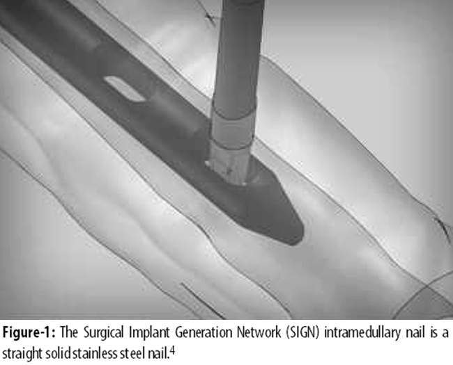 In developing countries, such as Pakistan, patients from poverty are unable to afford the cost of intramedullary nails. Surgical Implant Generation Network (SIGN), a non-profit organisation from America, has been doing charitable work in Pakistan in collaboration with some tertiary hospitals since 2002. They have been providing solid intramedullary fixation of femoral and tibial fractures for patients who could not afford commercial cannulated interlocking nails. However, the nails were initially designed for tibial fractures and were eventually considered for femoral shaft fractures as an extended use. Ikem et al. did a prospective descriptive analysis of 40 patients with diaphyseal fractures of the tibia, humerus, and mainly the femur (65%) treated with SIGN intramedullary nails (Figure-1).
