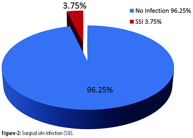 In terms of SSIs, only 3(3.75%) patients had them and were managed with antibiotics (Figure-2).